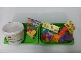 Dárková sada obsahuje 2 x pískovničku 40 x 30 x 10 cm s víkem, náhradní náplň kouzelného ( dynamického ) písku 1 x 5 kg v plastové krabici s víkem 30x20x14 cm , 1x set 3D formičky MAXI ( kůň, lev, kočka, krokodýl velikost cca 15 cm ), 1 x set 3D formičky MINI a sadu vytlačovátek ( 12 ks ) s válečkem.