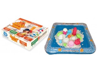 1000 g kouzelného písku, 11 ks formiček, lžíce na zmrzlinu a kornoutek, 1 ks pracovní nafukovací tác, vše baleno v barevné pevné kartonové krabici.